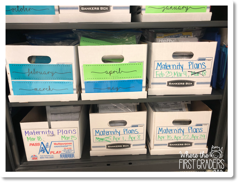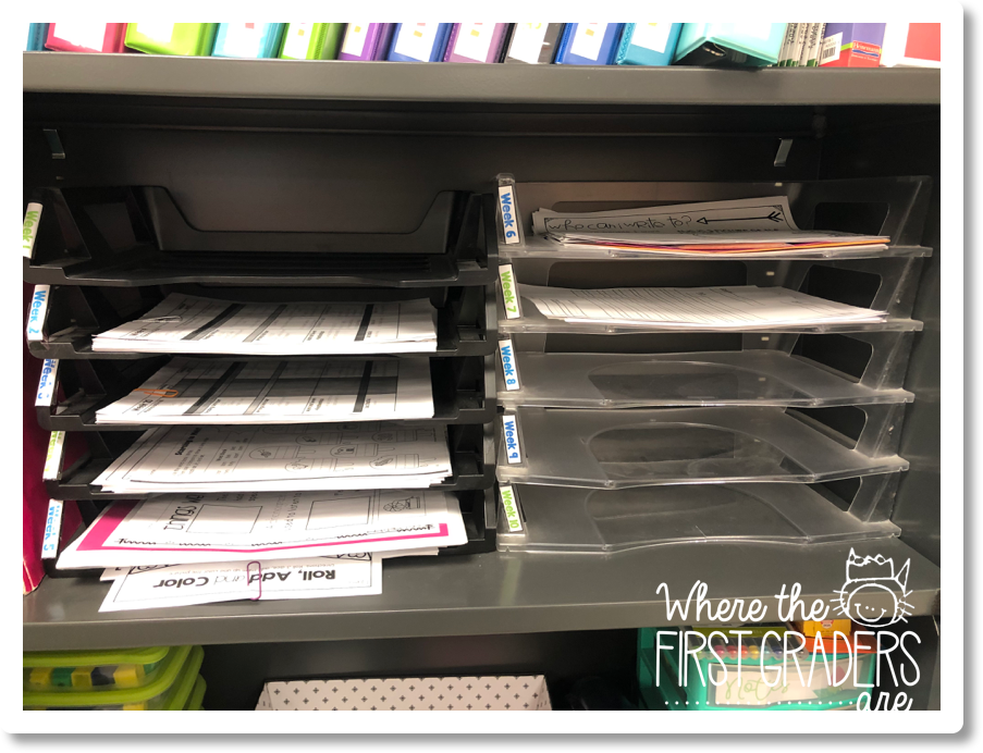 As you can see, I have 10 paper trays that are labeled Week 1-10. I use these on a normal basis, but they worked perfect for maternity planning, too. As I find a resource I want to use, I store it in the appropriate paper tray until I'm ready to make all of my copies for that week. I usually keep a sticky note on the top paper of each tray that lists the date for that week (ex: Jan 7-11) and any other special notes I might need such as “Valentine's Week” or “Starting coins”.