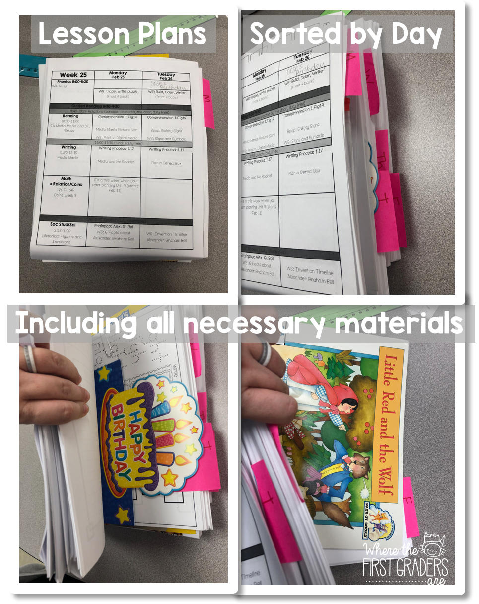 So you've typed in all of your lesson plans and gathered all of your materials. What now? Copy and sort them by day and include all necessary materials.