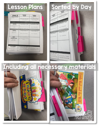 I put a copy of my lesson plans on top and my daily resources underneath. I didn't do anything fancy with the sorting by, as you can see, I simply used a post it note indicated Monday-Friday. When I say gather materials I mean everything from hats for student birthday to mentor texts to station materials for the week. Do not make your sub go hunt for things, have everything prepped and ready!