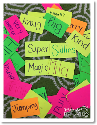 Instead of an anchor chart, I had my students write their own names on index cards (with marker because I wanted to be a cool teacher…not really, but it's hard to read pencil on colored index cards). Then, I wrote their matching adjective on a different index card and put the cards in a pocket chart during our whole group lesson.