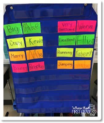 Instead of an anchor chart, I had my students write their own names on index cards (with marker because I wanted to be a cool teacher…not really, but it's hard to read pencil on colored index cards). Then, I wrote their matching adjective on a different index card and put the cards in a pocket chart during our whole group lesson.